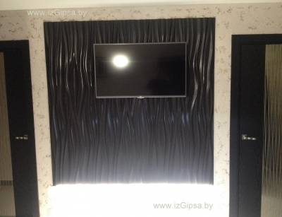Хорошо смонтированы и окрашены черной глянцевой краской 3D панели стали похожи на пластиковые. И только то что в них нет швов выдает то, что они гипсовые. Панели были изготовлены нашей мастерской.