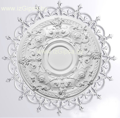 Гипсовая потолочная розетка состоящая из множества мелких декоративных элементов расположенных по периметру гипсовой розетки: http://www.izgipsa.by/load/lepnina/rozetki_svetilniki/27 , была смонтированная нашими мастерами. Потолочная лепнина богато и роскошно смотрится с хрустальными люстрами. Диаметр розетки около 1 метра.