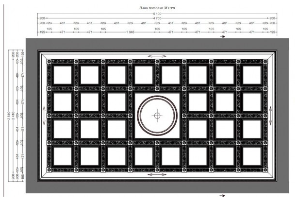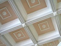 Опишем как делается имитации кессонного потолка. Для начала рассчитывают расстояние между балками и размер кессонов, рисуют искиз. Затем изготавливают конструкцию из гипсокартона и отшпаклевывают её. Далее в ниши по периметру наклеивают гипсовые карнизы, а сами балки и середину кессонов украшают молдингами, декоративными элементами из гипса